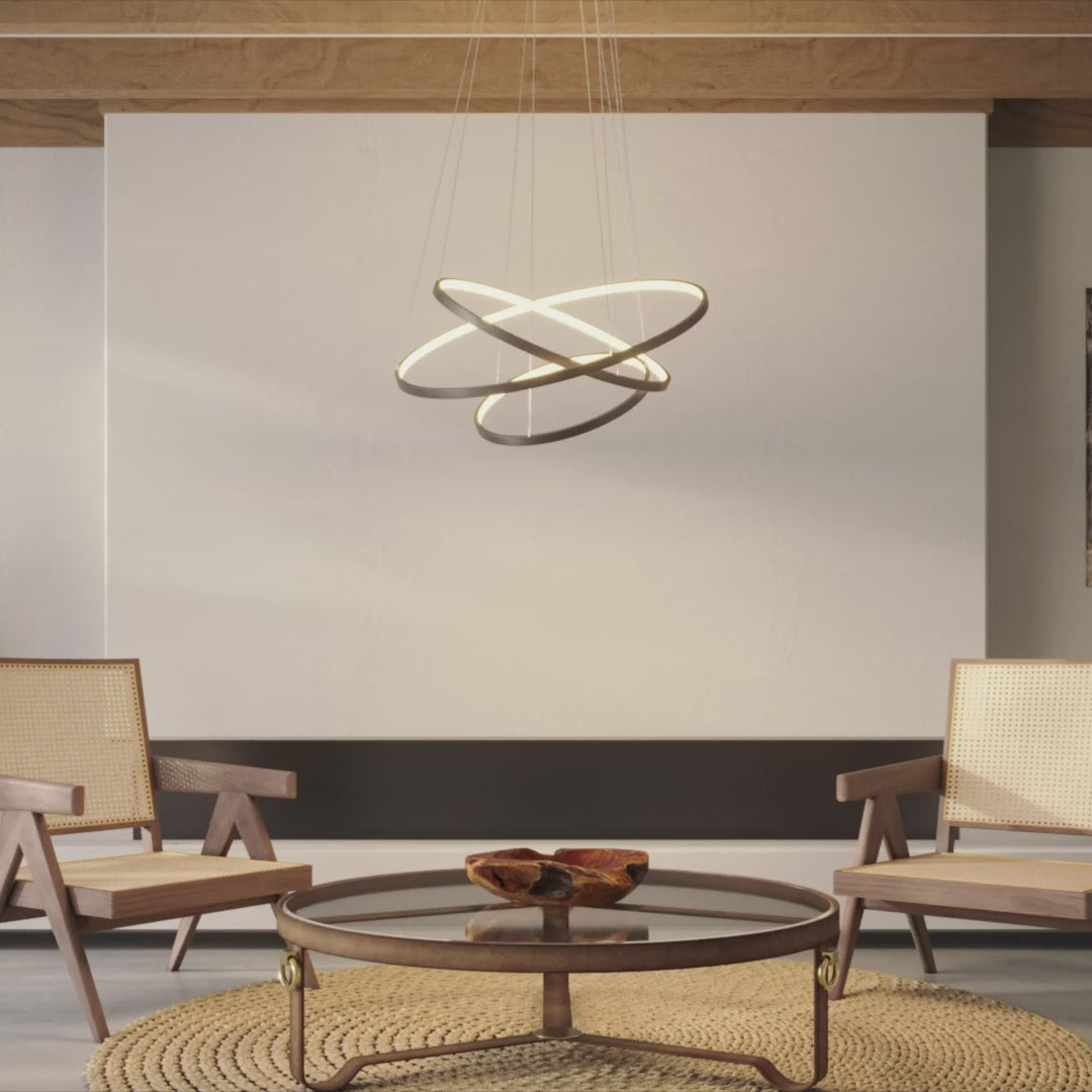 Majestueuse et aérienne, COSMIRA réinvente la suspension avec une composition lumineuse tout en légèreté. Ses trois anneaux concentriques, flottant à différentes hauteurs, diffusent une lumière douce et enveloppante vers l’intérieur, comme un halo suspendu dans l’espace.